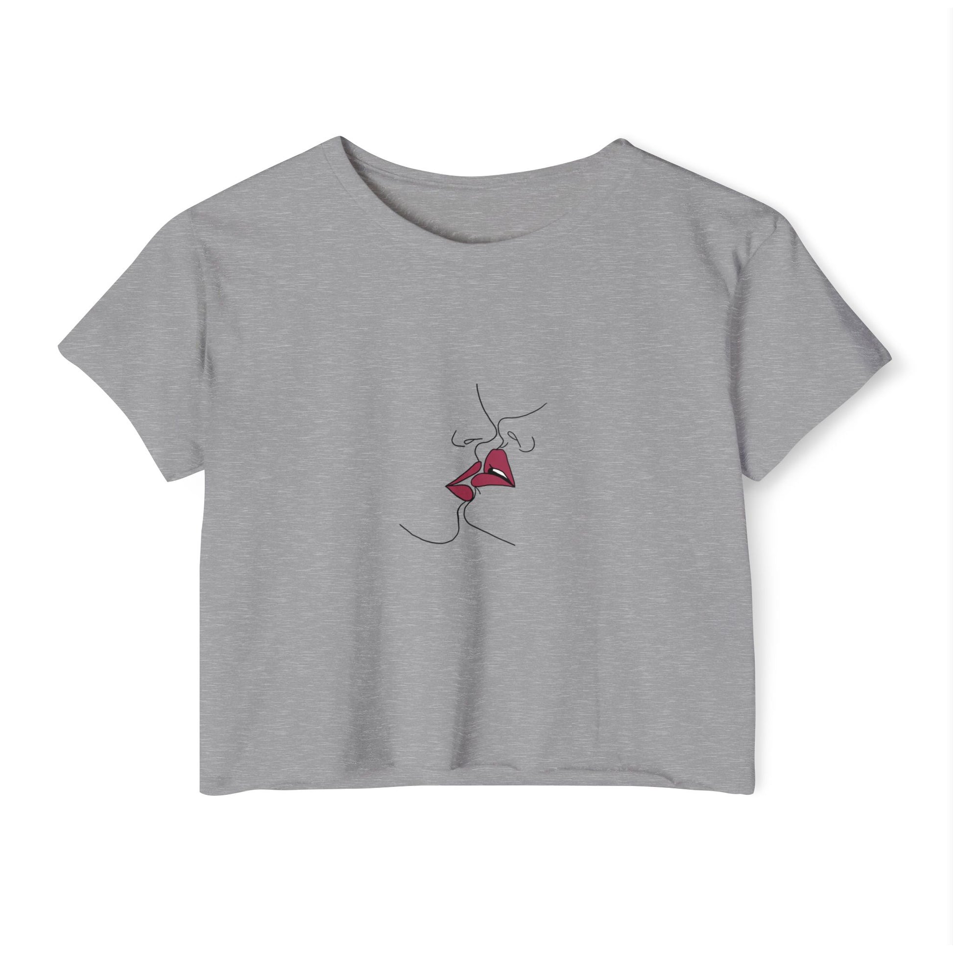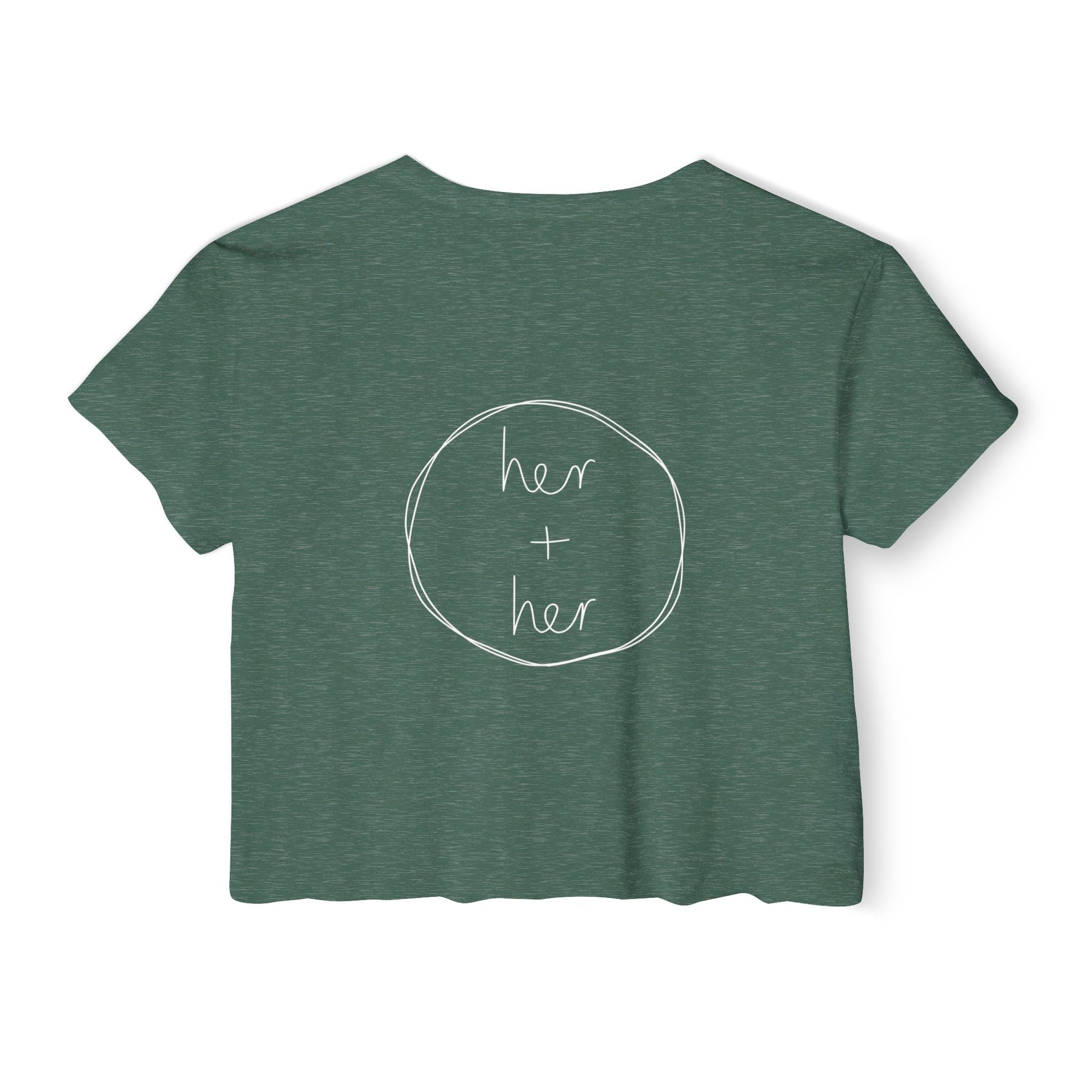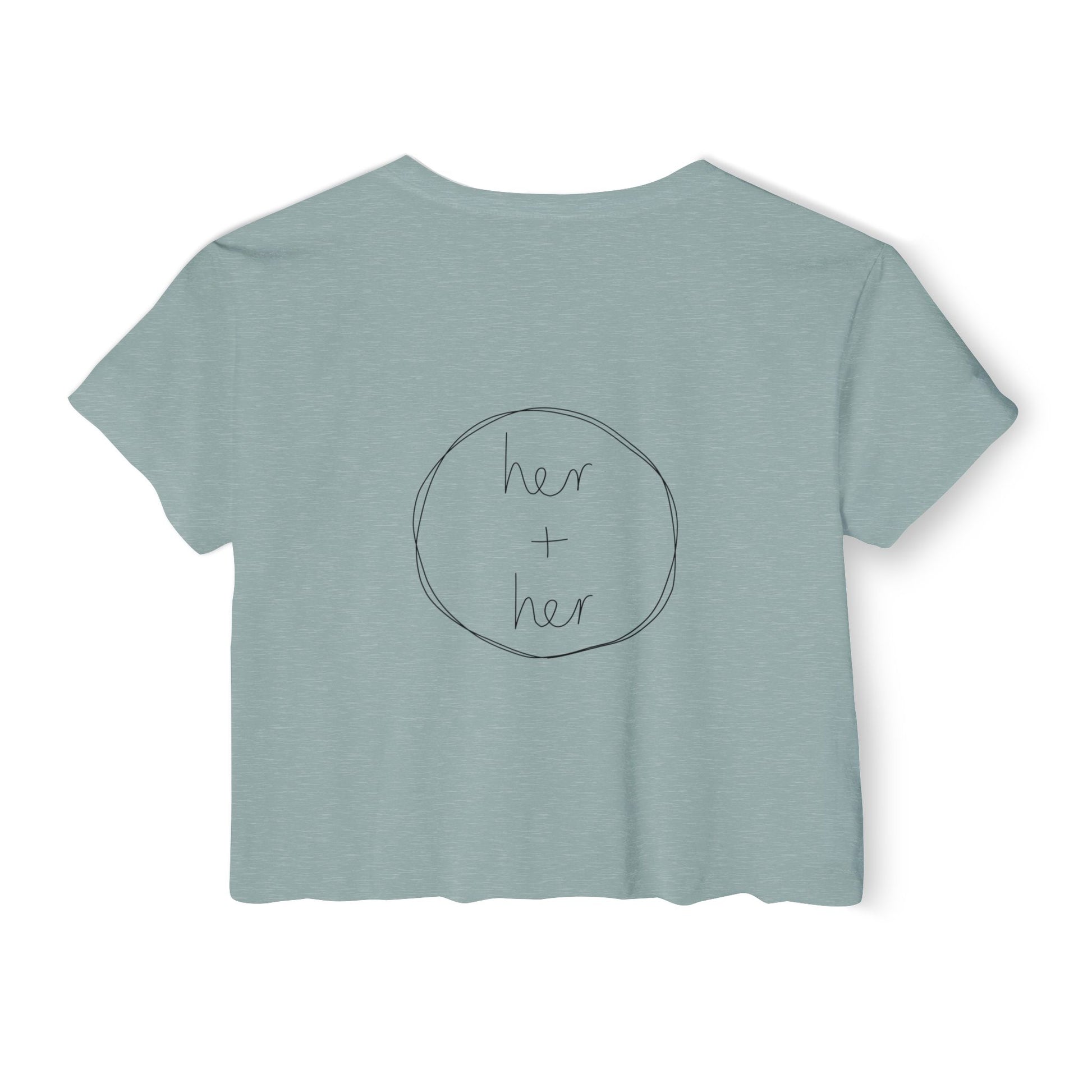 This crop tee features a simple line drawing of two women kissing, printed on the front — minimal, intentional, and unmistakably sapphic. Paired with the Her + Her logo on the back, it’s a subtle expression of connection and intimacy.